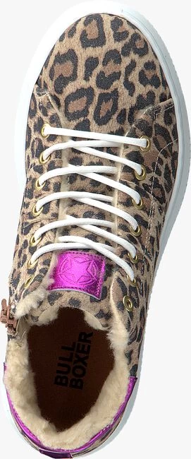 Deze hoge sneaker ALG500 komt uit de collectie van het merk BULLBOXER. De buitenkant is gemaakt van beige ruw suède met luipaardprint. Opvallend zijn de witte veters en de roze metallic accenten aan de tong en hiel. De voering is gemaakt van heerlijk zacht textiel wat zorgt voor warme voeten en het voetbed is uitneembaar. Leuk detail is het wafeltjes patroon in de rubberen zool. Het gripvaste profiel zorgt voor voldoende grip en stabiliteit. Je trekt ‘m gemakkelijk aan en uit dankzij de handige ritssluiting, zo hoef je ook niet iedere keer je veters te strikken. Ideaal!Â