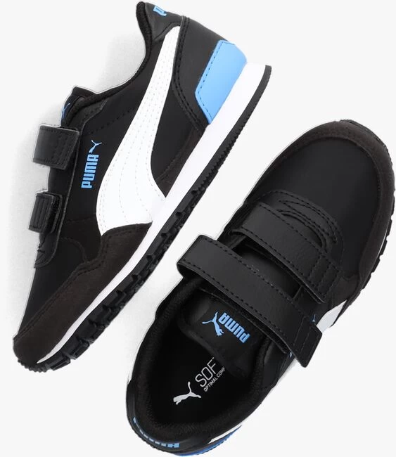 Deze zwarte, lage sneaker ST RUNNER V3 NL V is van het merk PUMA en heeft een levendig design met veelzijdige panelen en een toffe uitstraling! Je kunt ‘m overal bij dragen en hij zit superlekker! Dit model is gemaakt van zwart geweven textiel in combinatie met suèdelook en leatherlook. Op de zijkant en tong bevinden zich merkopdrukken, de zijkant is voorzien van een witte PUMA-formstrip en de hielkap heeft het bekende, blauwe PUMA catlogo. Je trekt dit model supergemakkelijk aan dankzij de zwarte klittenbandsluitingen op de wreef. De hiel is extra verstevigd met een blauw, lederlook hielstabilisator en de loopzool loopt door tot de neus, zodat het slijtage tegengaat. Het binnenwerk is van mesh en heeft een uitneembaar, textiel Soft Foam-voetbed voor optimaal comfort. De witte, microrubberen zool heeft een zwarte loopzool met een geribbeld profiel voor een uitstekende grip en stabiliteit. Combineer ‘m onder een toffe jeans met de pijpen iets opgerold, zodat jouw Puma’s lekker opvallen!