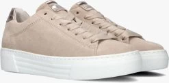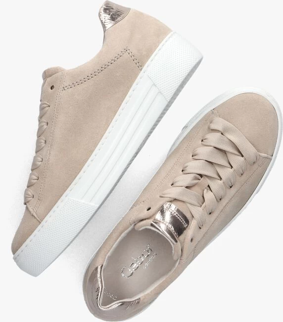 Deze basic sneaker is overal bij te combineren en is een perfecte toevoeging aan jou schoenengarderobe. Deze lichtbruine, lage sneaker 460.1 met lichtgewicht plateauzool en stoere accenten komt uit de Comfort collectie van het merk Gabor. Comfort schoenen hebben meer volume bij de tenen en bij de bal van de voet en bieden voor iedere voet de noodzakelijke ruimte. Dit model is uitgevoerd in hoogwaardig suède met dubbel stikselwerk, metallic accenten op de tong en hiel en heeft een opvallende brede veter. Het binnenwerk is van zacht bad textiel en het leren voetbed is uitneembaar. De sportieve, witte rubberzool heeft extra stootranden rondom de neus en hiel en een gripvast loopzool voor extra stabiliteit bij iedere stap. Combineer dit model eindeloos onder al je favoriete outfits.