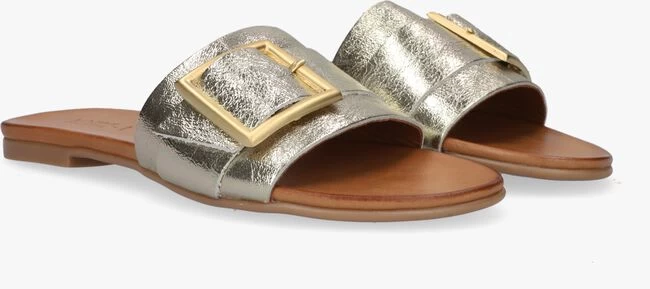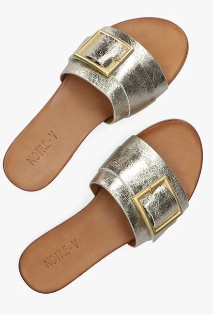 Een elegante sandaal is deze zomer onmisbaar in je schoenenkast! Dit metallic gouden 10201 model is van het merk NOTRE-V en is perfect voor je alledaagse outfits! Deze sandaal heeft een brede band over de wreef die elegant is afgewerkt met een grote gouden gesp. Het binnenwerk van deze sandaal is afgewerkt met zacht, soepel leer met een licht gevoerd voetbed wat zorgt voor een comfortabel gevoel. De loopzool is flexibel afgewerkt met rubber en heeft een klein hakje van ongeveer 1,5 centimeter. Combineer deze toffe slipper stijlvol en vrouwelijk met jouw lievelingsjurk of -broek! Waar draag jij ‘m bij?