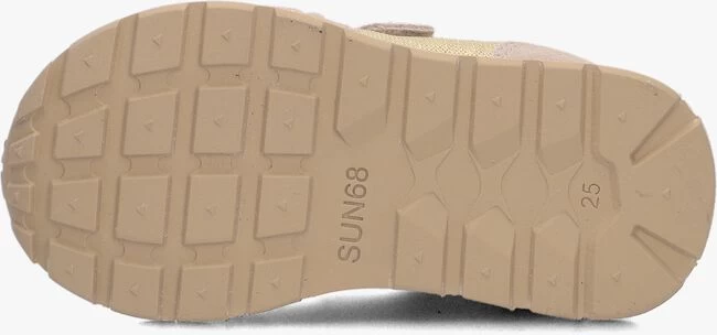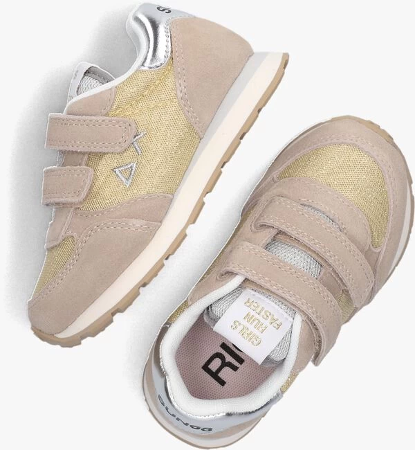 SUN68 is een Italiaans modemerk met casual designs van de beste materialen om iedere dag te dragen. Er is veel aandacht voor originele details en onderzoek in goede materialen. Dit goudkleurige model GIRLS ALLY GLITTER met zilverkleurige accenten is uitgevoerd in stevig glitter textiel en heeft een afwerking van beige suède panelen. Op de mesh tong bevindt zich een wit textiel label met de opdruk: “RUN FASTER THAN YOU CAN” en de hiel heeft een zilverkleurige, leatherlook hielkap met zwarte merkopdruk. De zilverkleurige geborduurde merkopdruk op de zijkant en de grijze accentstreep in de zoolrand maken ‘m extra opvallend. Deze lichtgewicht sneaker is gevoerd met ademend mesh en heeft een vast voetbed met comfortabele demping. Door de gewatteerde enkelkraag en tong ervaar je veel steun en met de beige loopzool met vierkanten noppen profiel heb je een optimale grip.