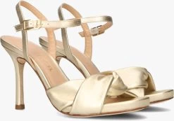 Ga voor een elegante ook met deze goudkleurige sandaal YUSUF met ronde neus en naaldhak van het merk UNISA! Dit unieke model van leer heeft twee banden op de voorvoet en een sierlijk enkelbandje met handige, goudkleurige gespsluiting. Alle bandjes zijn gevoerd met soepel leer en suède. Het leren voetbed heeft een toplaag en een licht dempende werking voor een comfortabel gevoel. Mooi detail is dat de naaldhak bekleed is met hetzelfde leer, waardoor de sandaal een sophisticated uitstraling heeft onder jouw outfit. De rubberen loopzool en haktip zorgen voor een goede grip. De hak heeft een hoogte van ruim 10 centimeter. Combineer ‘m met jouw mooiste outfit en steel de show! Â
