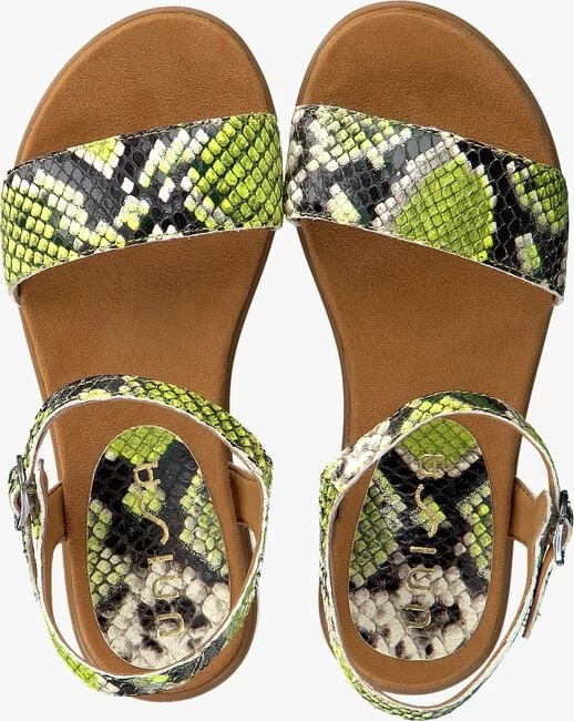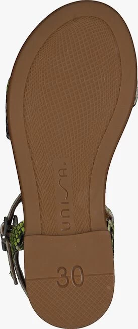 Laat de zon maar stralen want met deze gele sandalen LIRITA van het merk Unisa ben jij er helemaal klaar voor! Het bovenwerk is gemaakt van geel lederlook met slangenprint en een zilverkleurige glitterfinish en heeft een brede band over de voet en smalle bandjes met een gespsluiting om de enkel. Het voetbed is uitgevoerd in suèdelook en voelt heerlijk zacht aan. De rubberen zool met mini hakje en fijn profiel zorgt voor veel grip en flexibiliteit.  Â