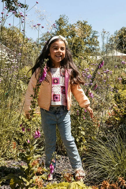 Extra leuk dit toffe jasje is reversible, draag hem met de roze of oranje kant naar buiten.