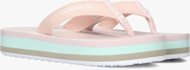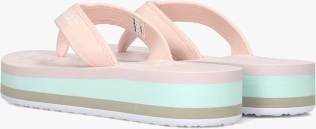 Deze lichtroze teenslipper STICK komt uit de collectie van het merk NAPAPIJRI. Dit model heeft een textiele band met een zacht teenstuk en een witte merkopdruk. Dit model is gemaakt van lichtgewicht rubber met een plateauzool die vrolijk is afgewerkt met beige,- groene,- roze en witte accentstrepen en het voetbed is gesierd met een oversized merkopdruk. Het profiel in de loopzool zorgt voor een uitstekende grip bij iedere stap. Draag ze lekker comfi naar het zwembad, thuis of naar het strand met dit model ben je klaar voor warme zomerse dagen.