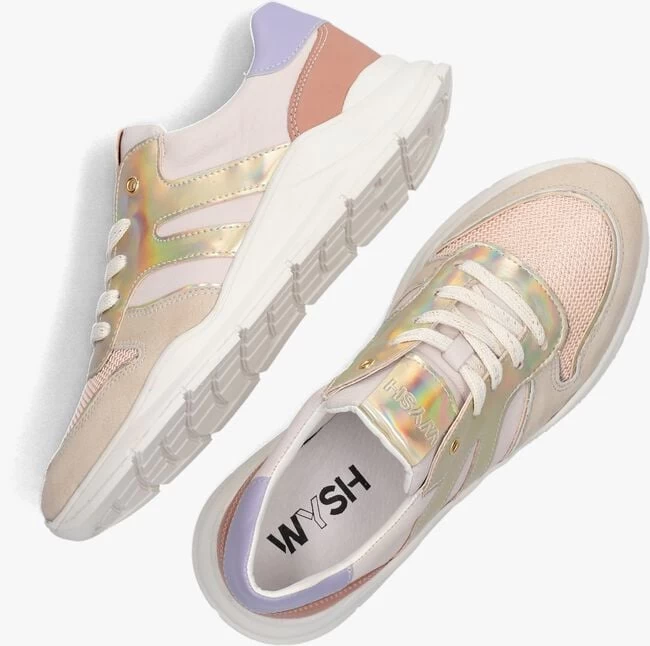 De JESSIE lage sneaker van WYSH voor meisjes is een perfecte mix van stijl en comfort. De schoen heeft een roze kleur van leer met panelen van beige suède, metallic, paars en roze leer. De neus is gemaakt van roze, geweven textiel met glitters. De binnenvoering is gemaakt van leatherlook en heeft een vast, leren voetbed. De chunky, rubberen zool biedt voldoende demping en ondersteuning tijdens het lopen en spelen. Het merkembleem is te vinden op de tong. Deze sneaker is een musthave voor je garderobe!