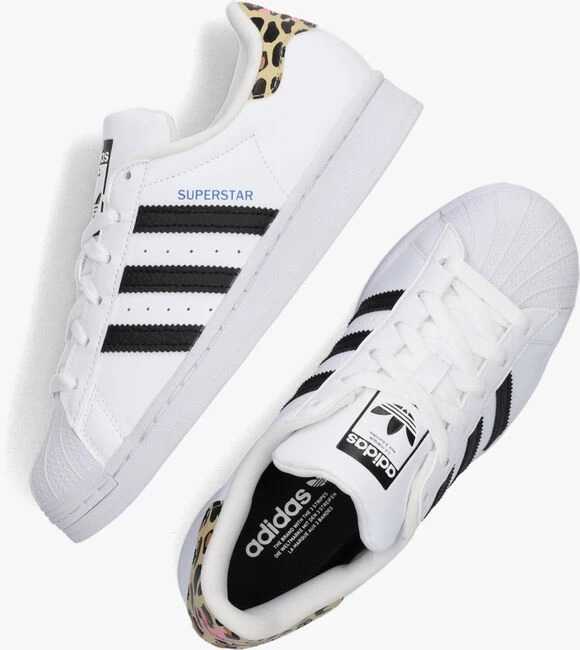 Maak kennis met deze witte lage sneaker, SUPERSTAR J, van het merk ADIDAS. Dit klassieke model is gemaakt van wit leatherlook met de authentieke 3-Strips op de zijkant met een klein kartelrandje en een merkopdruk in een zwarte en blauwe kleur. Ook de tong is gesierd met een zwarte merkopdruk en de opvallende hielcap met stoere panterprint heeft een roze merkopdruk. De neus is gemaakt van rubber met een reliëf zodat de schoen goed tegen een stootje kan en hij langer mooi blijft. Het binnenwerk is gemaakt van textiel die samen met de gevoerde enkelkraag en het uitneembare voetbed zorgen voor een optimaal comfort tijdens het rennen en spelen. Extra fijn zijn de grove perforaties op de zijkant van de sneaker voor een goed ademend vermogen van de voet. De witte rubberen zool heeft een reliëf printje op de zoolrand en de loopzool heeft een gripvast golvend profiel voor enorm veel grip.Â