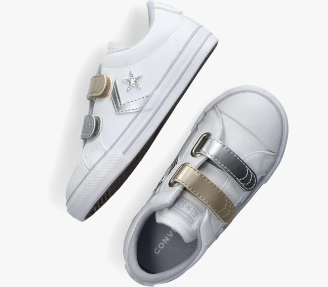 Deze witte STAR PLAYER 2V METALLICĀ Ā lageĀ sneakerĀ van het bekende schoenenmerk CONVERSE is eindeloos te combineren bij al jeĀ outfits!Ā De opvallende rubberen neus en stootrand met zilvergrijs accentstreep geven deze schoen de kenmerkende Converse-look. Extra leuk is de klittenbandsluiting in zilver en goud en het bijpassende merkembleem aan de zijkant van de schoen in de kleur zilver.Ā De schoen heeft een bovenwerk van wit leer met een mesh voering en een uitneembaarĀ voetbedĀ en een rubberen zool met gripvast profiel. Combineren is niet moeilijk want dit model en kleur past bij ontelbare outfits!Ā