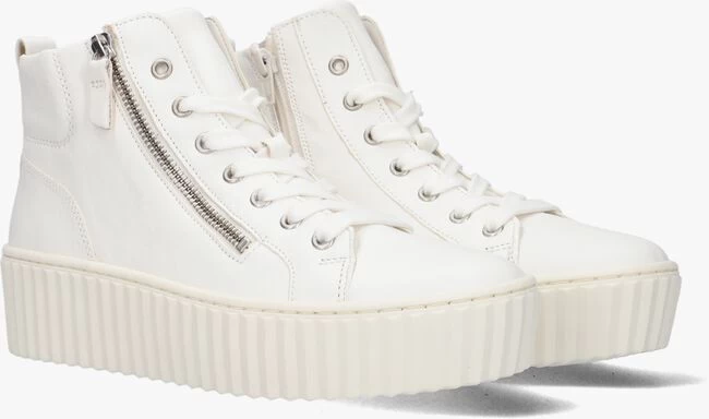 Deze hoge sneaker 210 1 komt uit de collectie van het bekende merk GABOR en is gemaakt van wit leer en heeft een zilverkleurige ritssluiting aan de buitenzijde ter decoratie. Je trekt ‘m gemakkelijk aan en uit dankzij de ritssluiting aan de binnenzijde en met de veters kun je het model passend maken. Leuke details zijn de metalen veterringetjes en de aantreklus op de hiel. De voering is gemaakt van zacht textiel en het voetbed is uitneembaar. Met de gewatteerde enkelkraag ervaar je een fijn draagcomfort en de hoge geribbelde zool zorgt voor voldoende stabiliteit. Combineer ‘m casual met een leuke skinny jeans!