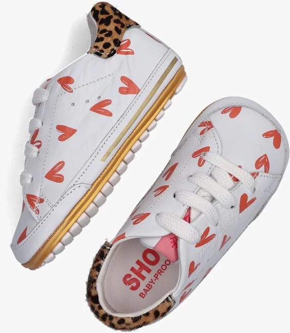 Die eerste echte schoentjes moeten niet alleen heel functioneel zijn maar natuurlijk ook heel stoer, want leren lopen is een heel avontuur! Heel dapper loopt jouw kleintje stoer rond op deze BabyProof babyschoentjes BP21S058 van het merk SHOESME. De buitenkant is gemaakt van wit leer met een print van rode hartjes en een ponyhair hielcap met panterprint. De binnenkant heeft een leren voering en een uitneembaar voetbed en de tong is voorzien van een roze textiel merklabel. Het schoentje is licht van gewicht, is voorzien van een flexibel rubberen zooltje met gripvast profiel en begeleid je kindje van kruipen naar lopen.