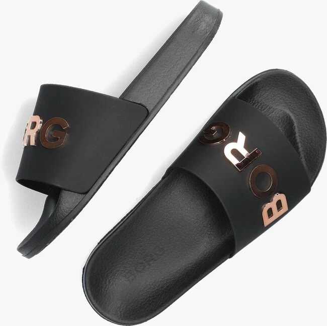 Deze zwarte lichtgewicht badslipper KNOX MLD K komt uit de collectie van het merk BJORN BORG. Dit model heeft een glad rubberen band met spiegelende roségouden merkopdruk en een rubberen licht voorgevormd voetbed. Het profiel onder de loopzool zorgt voor een goede grip tijdens het rennen, spelen en klauteren. Draag ze super comfortabel rondom het huis, naar het zwembad, strand of zelfs naar de stad.