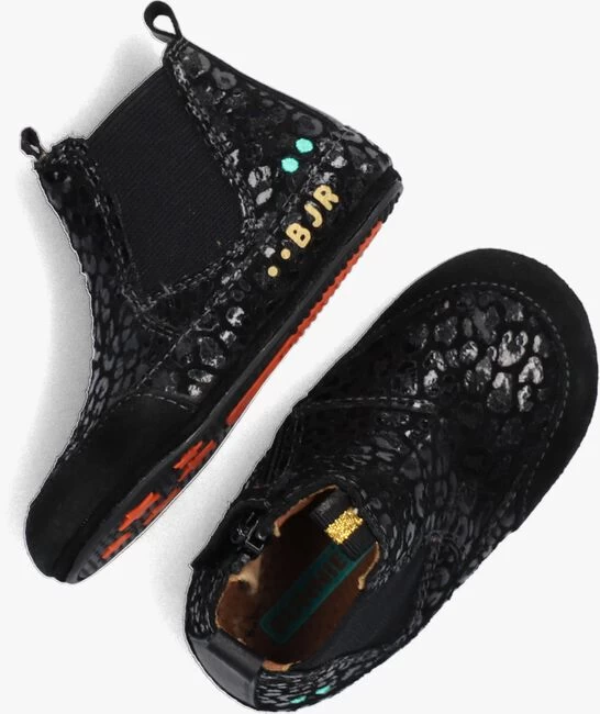 Deze superschattige babyschoentjes ZONNE ZACHT komen uit de collectie van het merk BUNNIES JR en maken de outfit van je kindje helemaal af. Een ideaal schoentje voor je kleintje zodra de eerste stapjes worden gezet. De buitenkant is gemaakt van zwart suède met een glanzende panterprint en is voorzien van een suède paneel op de neus. Het elastiek in het zijpand zorgt voor een trendy uitstraling en een prettig loopcomfort. De voering is gemaakt van leer en het voetbedje is uitneembaar. Het rubberen zooltje is superflexibel en heeft een anti-slip profiel wat zorgt voor veel grip en stabiliteit. Je trekt dit schoentje eenvoudig aan en uit dankzij de ritssluiting aan de zijkant en de aantreklusjes op de schacht. Een ideaal schoentje voor thuis of bij de oppas!