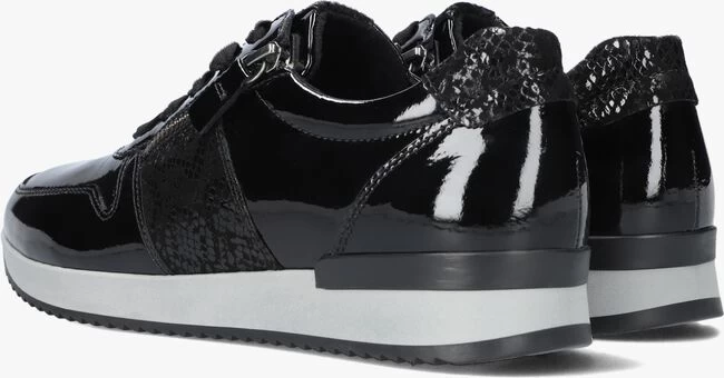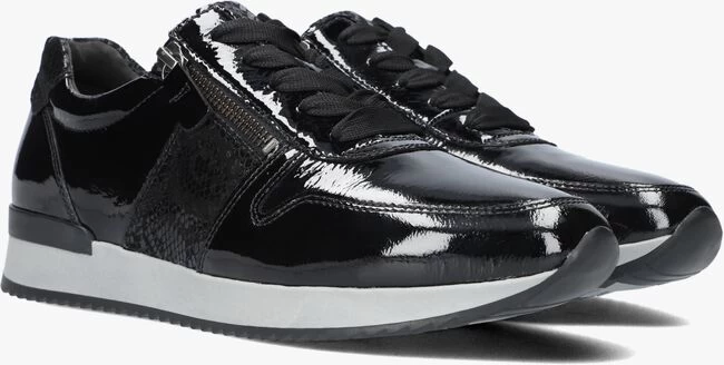 Deze zwarte lage sneaker 420 met snakeprint accenten komt uit de collectie van GABOR. Dit model is uitgevoerd in hoogwaardig lakleer met een moderne slangenprint inzet van suède op de hiel, tong en zijkant. De schoen is gesierd met extra brede veters en heeft een bijzonder handige dubbele ritssluiting naast de veters. Het binnenwerk is van textiel en het leren voetbed is uitneembaar. De sportieve rubberzool heeft een gripvast ribbelprofiel en op de hiel bevindt zich een rubberen inzet voor extra steun.