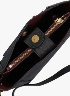 Deze zwarte schoudertas AUBREYL van het merk JASPER CONRAN is uitgevoerd in gestructureerd leatherlook met een lange schouderband en een ruim hoofdvak die tevens ook te scheiden is in twee vakken met de uitneembare etui om al jouw belangrijke spullen in op te bergen. De tas is gevoerd met leather-en suèdelook en is af te sluiten met een magnetische drukknoop. Extra leuk detail op de voorzijde van de tas zijn nog twee extra steekvakjes bevestigd en een ritsvakje voor al je kleine essentials. Afmetingen: 22 x 10 x 24 centimeter (Lengte x Breedte x Hoogte).