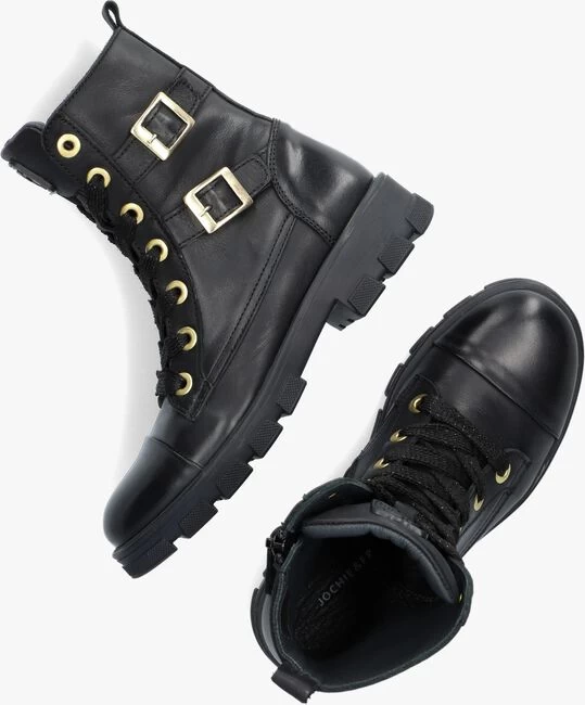 Het familiebedrijf JOCHIE & FREAKS maakt al sinds 1951 modieuze baby- en kinderschoenen. Dat doen ze met veel passie, aandacht en ambacht. Alleen de beste materialen worden gebruikt en dat zie je in ieder ontwerp terug. Deze zwarte veterboot MARIEKE is gemaakt van licht gestructureerd leer en heeft goudkleurige accenten, zoals de veterringen en de siergespjes op de schacht. Daarnaast heeft de schoen een speelse neusnaad, een rubberen merkembleem op de tong en een klein aantreklusje aachter op de schacht. Dankzij de handige zijrits kan jouw kleine meid deze fijne schoen zelf aan- en uittrekken en heb jij je handen vrij. De leren voering met uitneembaar, dempend voetbed zorgt voor een hoog comfort en de rubberen zool met grof profiel heeft een hoge flexibiliteit, maar zorgt ook voor een stoere uitstraling.