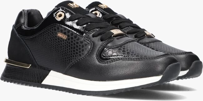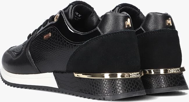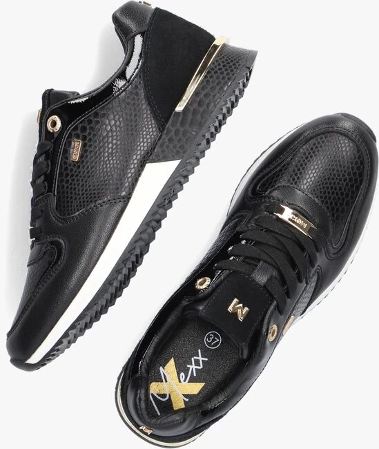Deze toffe trendy lage sneaker FLEUR komt uit de collectie van het merk MEXX. De buitenkant is gemaakt van zwart leer met krokoprint, suède panelen en lak accenten. Opvallend is de print die ook terug te zien is in de witte tussenzool en de goudkleurige metalen hielstabilisator met merkreliëf. Toffe details zijn de goudkleurige emblemen op de tong, zijkant en veters en het kettinkje met merkembleem die bevestigd zit aan een veterring. Het binnenwerk heeft een voering van leer in combinatie met textiel en een uitneembaar dempend voetbed die samen met de gevoerde enkelkraag enorm veel steun biedt. De zwarte loopzool met gripvast profiel zorgt voor een goede grip en stabiliteit. Combineer ‘m onder al je favoriete outfits!
