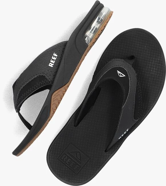 Uit de collectie van het merk Reef is deze comfortabele slipper FANNING KIDS. Dit zwarte model heeft een zacht voetbed van opgevuld rubber met anatomische ondersteuning voor optimaal comfort tijdens ieder avontuur. De wreefband van zacht textiel en rubber is voorzien van twee merkopdrukken. De zool met 360 degree heel airbag is van rubber en heeft een gripvast profiel.