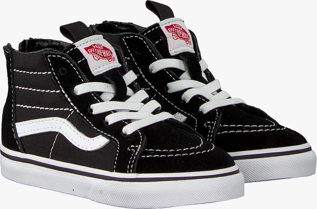 De bekende SK8-HI ZIP TD hoge sneaker is een legendarisch model in de collectie van het merk Vans. Deze hoge zwarte skateschoen is uitgevoerd in suède en canvas en heeft een voering van textiel met een vast voetbed. Opvallende details zijn de bekende leren lijn op de zijkant en de merklabels op de tong en de hiel. De neus is verstevigd met een stootrand en beschermt tegen slijtage. De gevoerde enkelkraag biedt ondersteuning en flexibiliteit en de rubberen zool met wafelprofiel biedt grip bij het lopen. Dit model heeft de klassieke stiksels met perforaties op de neus. Extra handig is de ritssluiting aan de hiel, hierdoor trek je ze gemakkelijk aan en uit.